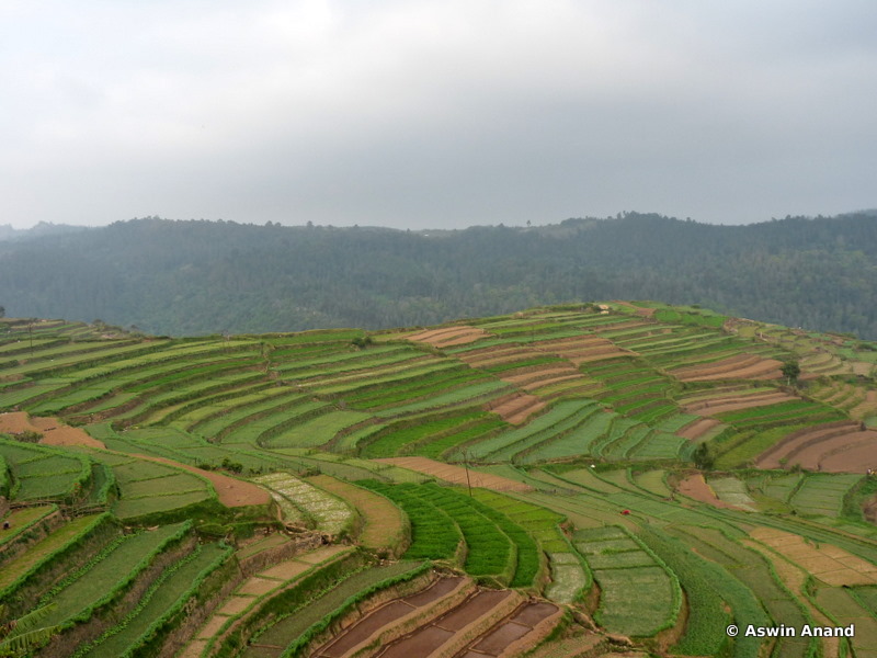 We crossed the waterfall and moved on to the opposite valley. It was in fact a farm and we were moving through it. Water from the waterfall was being used to irrigate it and was re-routed with filters effectively. We reached a higher portion of the same falls through the valley and crossed it by means of a log bridge. Soon after, we emerged in to a third hill of the day.